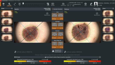 Ergänzend arbeite ich mit FotoFinder, dem führenden KI-gestützten System für langfristige Hautkrebsvorsorge. Bei der Untersuchung erfolgt zuerst eine Übersichtsaufnahme Ihrer Haut, bei der atypische Muttermale zusätzlich auflichtmikroskopisch aufgenommen werden. Das ermöglicht mir bösartige oder verdächtige Hautveränderungen in vielfacher Vergrößerung zu sehen und somit früher zu erkennen. Dank der digitalen Speicherung Ihres Hautbildes habe ich bei den Nachfolgeuntersuchungen einen direkten Vergleich von früheren und aktuellen Haufbefunden. So werden selbst minimalste Veränderungen sichtbar. Die Untersuchung ist völlig schmerzfrei und kann am Bildschirm mitverfolgt werden.